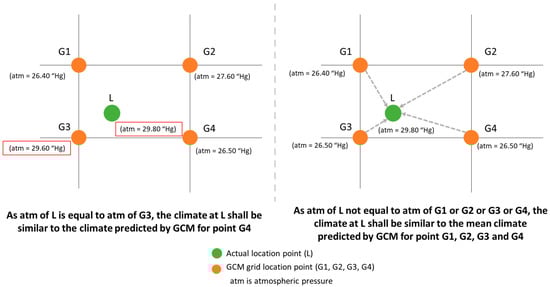 The location details from the TMY file act as an input for the extraction of the climate data from the outputs of the CanESM2 model. The spatial resolution of the CanESM2 model’s climate outputs is low, and the location of the weather file could be between any four grid points of the model. Thus, this study adopted a geo-filtering approach that first compares the atmospheric pressures of the datasets of all nearby grid points with the actual atmospheric pressure at the location stated in the weather file. Suppose that only one grid point possesses an atmospheric pressure with less than or equal to a 10% error with respect to the actual atmospheric pressure. That grid point’s mean daily climate variable data are extracted in that case. Otherwise, the distance-based weighted average of all nearby grid points’ climate data is referred to. The historical mean and the future predicted mean daily climate data are extracted from the CanESM2 climate model’s output database. Figure 2 illustrates the geo-filtering technique discussed in this section.