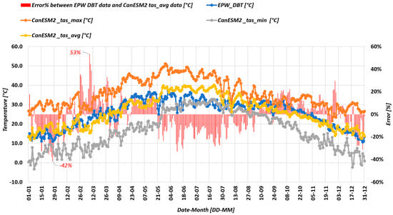 A bias always exists between climate models and observed data. Thus, bias correction needs to be employed for the future mean daily data to improve the accuracy of the climate predictions. A bias was recognized between the observed mean daily climate data from the TMY file for New Delhi, India and the historical mean daily data from the CanESM2 model. As shown in Figure 3, the historical mean max (CanESM2_tas_max) and min (CanESM2_Tas_min) daily dry bulb temperature data of the CanESM2 model showed a high error when compared to the dry bulb temperature data (EPW_DBT) from the EPW. The historical mean average (CanESM2_tas_avg) daily dry bulb temperature data obtained by averaging CanESM2_tas_max and CanESM2_tas_min also showed minimum and maximum error percentages of −42 and 53, respectively. Similarly, other climate variables, such as RH and direct normal solar radiation, were also observed to have a high error rate.