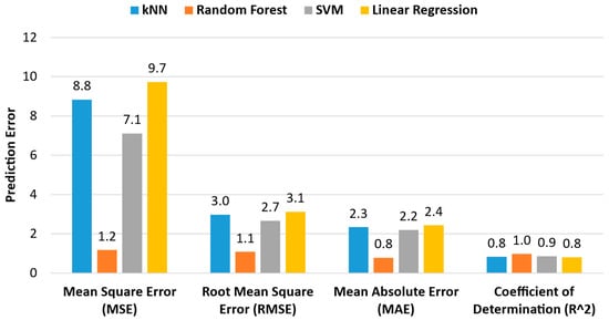 Regression-based bias corrections are usually employed for climate models. However, most correction methods possess strong assumptions and limitations that do not allow the model outputs to be calibrated [43]. Today, machine learning (ML) algorithms are commonly employed for prediction, classification, and clustering problems, but can also be referred to for bias correction. This study employed novel ML algorithms for bias correction by using historical data from the typical meteorological year weather file of the chosen location. Firstly, the kNN, random forest, SVM, and linear regression algorithms were tested for bias correction by using the present-day mean daily climate data and historical CanESM2 mean daily climate data. As shown in Figure 4, the random forest (RF) showed lower mean square, root mean square, and mean absolute errors. The coefficient of determination (R2) of the random forest algorithm was observed to be high in comparison with those of the other ML algorithms. Thus, this study employed RF-based ML models for bias correction for each climate variable.