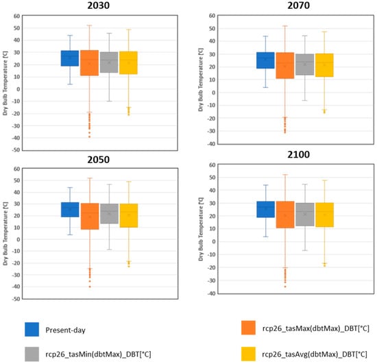 Box plots of the DBTmax, DBTmin, and DBTavg data for the present-day, 2030, 2050, 2070, and 2100 in the RCP2.6 scenario.