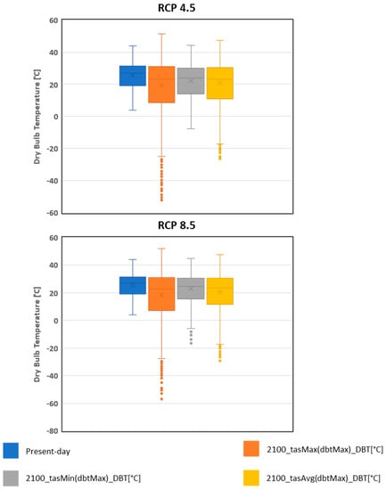 Box plot of the DBTmax, DBTmin, and DBTavg data for the year 2100 and the RCP 4.5 and 8.5 scenarios.