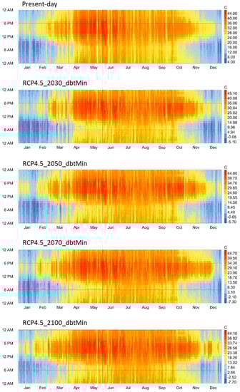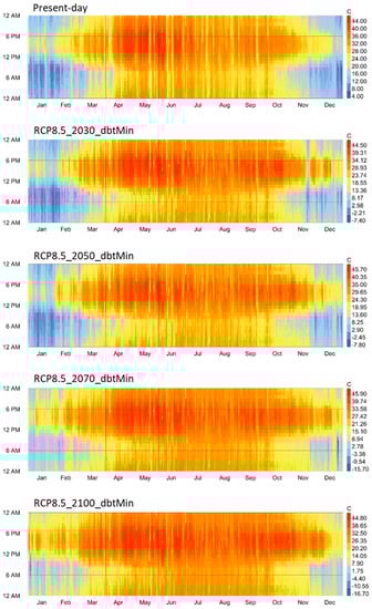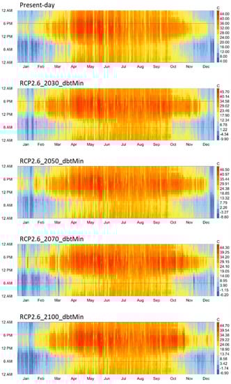 The DBT heatmaps were plotted for all years (2030, 2050, 2070, and 2100) for each scenario (RCP 2.6, RCP 4.5, and RCP 8.5) and compared against the DBT heatmap of the present day to understand the distribution and duration of extreme temperatures. This temporal distribution cannot be illustrated by using box plots. In the RCP 2.6 scenario, the maximum temperature occurred in 2050, followed by 2030, 2100, and 2070, in comparison with the present-day climate. The DBT heatmaps for RCP 2.6 for all future years (Figure 7) show an increase in the duration of heat stress from 10 months to almost 12 months. The heat intensity during winters is predicted to increase from mid-day to late evening.
