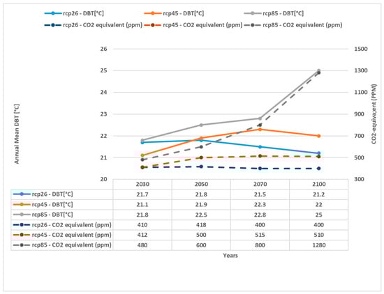 A similar increase in the duration of heat stress across months and hours in a day was also noted for the RCP 4.5 (Figure 8) and RCP 8.5 (Figure 9) scenarios. Along with heat stress, the cold stress seems to increase in the future. While the RCP 4.5 and 8.5 DBT predictions showed an increasing trend from 2030 to 2100, the RCP 2.6 DBT prediction did not show the same trend of a sequential increase. Therefore, the year-wise CO2-equivalent levels of each scenario were compared with the year-wise annual mean DBT predictions for the same scenario. As shown in Figure 10, for each RCP scenario, the CO2-equivalent levels and predicted annual mean DBTs revealed similar trends. When there was a temperature increase between two future scenarios, this led to an increase in CO2-equivalent levels and vice versa (e.g., the increase in the annual mean DBT from 21.8 °C in 2030 to 25 °C in 2010 in the RCP 8.5 prediction was associated with an increase in CO2-equivalent levels from 480 and 1280 PPM, respectively). This confirms the directly proportional relationship between the two parameters (i.e., the DBT and CO2-equivalent level) that can be identified when trying to simplify complex meteorological and environmental phenomena without considering the impact of uncertainty and climate sensibility.