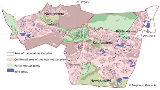Since the mid-2000s, seven partial master plans for housing were completed in the inner-city area (Figure 1). In this study, six valid partial master plans were explored, all of which propose a considerable increase in residential construction in the planning area. These areas are partial maters plans of Koilliskeskus, Niemenranta, Santalahti, Kalevanrinne, Vuores, and Hervantajärvi, ratified in years 2004, 2009, 2008, 2011, 2005, and 2014, respectively. The implementation of these areas was slow. In 2013, the share of housing construction achieved in areas covered by partial master plans was 8.2 hectares. The total number of inhabitants in these areas was 1250. At the end of 2013, there was an allocation for about 20,000 residents in the areas covered by the partial local master plans (Figure 2). In addition, certain areas designated for service activities, industry, or as survey areas in the local master plan were converted for housing by means of local detailed plans. The total area of housing plots in the infill area was 93 hectares with 8900 residents at the end of 2013.
