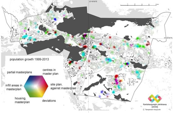 The population increase in housing construction from 1999 through 2013 based on the various infill development processes. Infill development has been implemented through various processes in areas where the growth pressure has been great, such as the city center and the suburb of Hervanta. On the other hand, there are extensive zones in the inner city area where the population has not increased through any of the processes (cyan, green spots), while remarkable volume was implemented via site plans (red spots). Image: City of Tampere/Jouko Järnefelt. Reprinted with permission from Ref. [56]. The City of Tampere.