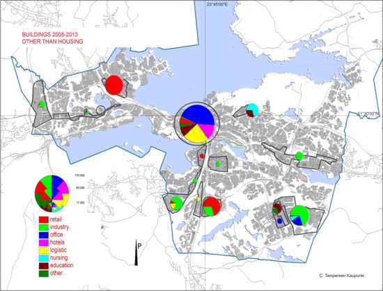 Buildings completed in the industrial, working, service, and central areas included in the local master plans between 2005 and 2013. The city center clearly stands out from the rest of the city as the most diverse construction area with the most significant volume. Some of the construction in the city center is linked to the publicly funded improvement of conditions such as the development of traffic systems. In other parts of the inner city, construction is less diverse and is smaller in volume. Image: City of Tampere/Maikki Jokinen. Reprinted with permission from Ref. [56]. The City of Tampere.