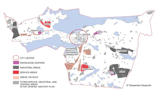 Locations of the most important working place areas in Tampere. Functional profiles emerge as a conclusion of the analysis of development processes in different areas. Reprinted with permission from Ref. [56]. The City of Tampere.