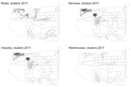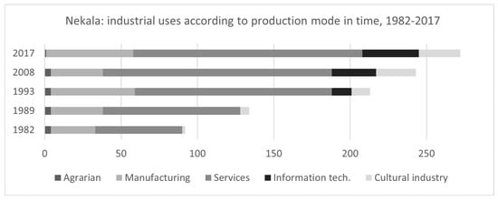 For several old industrial areas mostly on the southern side of the city center, construction and development appeared to have ceased. These areas cover Hatanpää, Nekala, Sarankulma, and Lakalaiva industrial districts, and the zone along Nokiantie Road in western Tampere. Starting from the 1980s, the diversity of uses has gradually increased in these areas. Some plots are still used for manufacturing activities, adhering to their original purpose. On other plots, local detailed plan amendments have made it possible to increase the share of business premises in the original building stock. Some local detailed plans and deviation decisions have allowed space for leisure activities or cultural economic actors (for example, photographers, architects, artists, a circus school). Significant numbers of associations and a variety of small service enterprises using subcontracting operate in these increasingly mixed areas. For example, in Nekala, actors benefit from colocation with similar actors for collaboration and competition [36] (Figure 6). Small-scale clusters of specialized retail, services or industrial uses have appeared from such behavior. Simultaneously in the area, the number of actors has increased between 1982 and 2016 from 91 to 267.