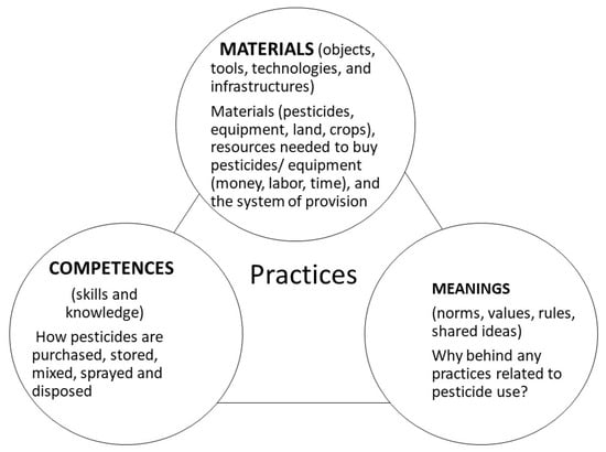 In order to overcome the shortcomings of reductive and individualistic approaches [54], the theory of practice came to exist as a useful theoretical framework that focuses on practices instead of individual attitudes, behaviors, and choices. Therefore, social practice theory has become an increased interest in many research areas and has been adopted for use in diverse disciplines [55]. This is observed in the latest research on pesticide use practices in Africa [12,37], but research on women represents a new field.