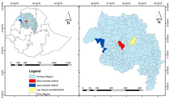 This study was conducted in the nine kebeles (the lowest administrative unit) of the three districts in the Amhara region of Ethiopia (see Figure 2). These districts (Dera, Lay Gaint, and Jawi) are located in different agroecological zones of the region with different farming systems and crops that justify differences in pesticide use practices [12,82].