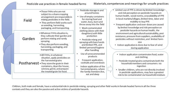 The materials, competences, and meanings that drive frequent application and overdoses of pesticides are pest infestation, pesticide resistance, pressure from suppliers, availability of pesticides without restriction in smaller quantities, limited knowledge and risk perception of pesticide hazards, and limited farm sizes (motivating uncritical application of pesticides). Unsafe practices may place a disproportionate risk on women, their children, consumers, and the environment. Like the women, the children helped with supporting work, were not trained in pesticide use, and thus contributed to unsafe practices (Figure 6).