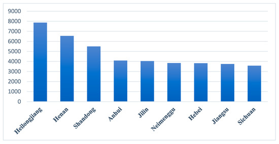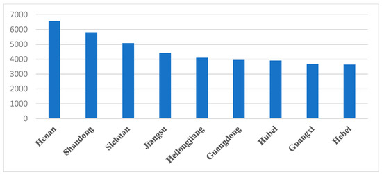 Located on the eastern coast of China, Shandong is a largely agricultural province and one of the most densely populated provinces in China, with highly dispersed small farms and land with an area of about 157,100 km2. At the same time, Shandong is an important agricultural province and a major grain producer, with a total grain production of 55,007,000 tons in 2021, ranking third in the country and accounting for 8% of the national total (Figure 2). the total agricultural output value of Shandong reached 581.45 billion yuan in 2021, ranking second (Figure 3). Shandong is thus a typical representative region of the eastern plain of China and an important production base for achieving food security strategies.