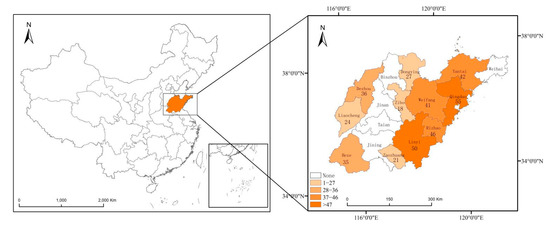 The data used in this paper come from a socioeconomic survey conducted by the subject group on farm households in Shandong Province on four separate occasions in July–August and November 2020. The questionnaire of this study was divided into 2 parts with 32 questions, of which the first part was the basic situation of the household with 12 questions, and the second part was the land management situation, including 6 questions on the basic situation of farmland and 14 questions on the transfer of farmland. The survey collected detailed information on the socio-economic of farm households, including household resource endowments, individual characteristics of household members, factor inputs and outputs, land transfers, and off-farm employment. To ensure that the sample reflects the overall situation in Shandong Province as comprehensively as possible, the team randomly selected two administrative townships in Qingdao, Rizhao, Dezhou, Liaocheng, Zibo, Zaozhuang, Heze, Yantai, Dongying, Weifang, and Linyi, and in principle, three administrative villages were randomly selected from each sample township. Since the land transfer rate in Qingdao exceeded 40% and the scale operation in its sample area reached more than 75%, four administrative villages were selected in each of the sample townships in Qingdao. Finally, to ensure the validity of the questionnaire, improve the response rate and guarantee the accuracy of the data, the team chose a face-to-face survey to collect the data. In the survey process, one investigator took 1–2 h to complete a questionnaire, giving farmers sufficient time to recall information about agricultural production, and each investigator completed 2–3 questionnaires per day. To ensure the authenticity of the data, survey respondents were randomly selected in the sample villages. Since the research subjects of this paper are new large-scale management subjects, i.e., professional cooperatives and family farms, only land-lease entry households in the sample villages were interviewed, and which type of management subjects were identified by whether they formally participated in cooperatives. Our study was conducted using a random sampling method to determine the sample townships and sample administrative villages, and 10 respondents were interviewed in each administrative village by face-to-face survey, and a total of 680 farm households were surveyed, including 426 farmland rental into household questionnaires, including 146 professional cooperatives and 280 family farms. Excluding some samples with unclear production cost values, there were 395 samples of large-scale business entities, including 142 professional cooperatives and 253 family farms. The survey questions we used and related definitions are shown in Table 1. The data cover 395 scale management subjects in 68 villages of 11 cities in Shandong Province, which can reflect the current scale management situation in Shandong Province on the whole (Figure 4).