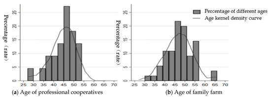 (3) In terms of control variables, compared with family farms, professional cooperatives have higher education level () and nonfarm employment rate (), indicating the higher education level and more nonfarm employment opportunities, which to a certain extent represents higher overall quality of professional cooperative operators. The age distribution of both types of operators was “dromedary” (Figure 7).The average age of family farm operators is 47 years old, with a maximum of 65 years old and 24.3% of those older than 50 years old, while the average age of professional cooperative operators is 44.3 years old, with only 3.6% of those older than 50 years old, and there are no operators older than 55 years old. There are operators older than 55 years old, i.e., the aging problem of family farm operators is more serious than that of professional cooperatives.