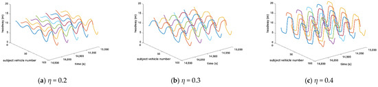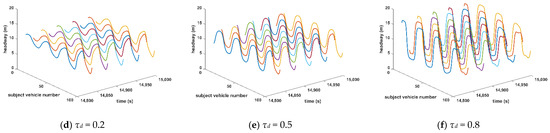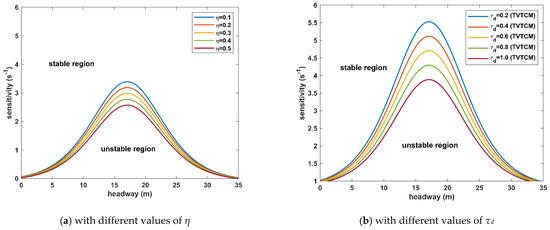 From Figure 1, the headway-sensitivity phase space is divided by the neutral stability curve into two regions. The regions above the neutral stability curve are stable ones, and the ones below the neutral stability curve are unstable regions. In the stable regions, the vehicle platoon can resist the disturbance and maintain a stable state. In the unstable regions, the vehicle platoon cannot resist the disturbance and evolute to an unstable state. Under such conditions, stop-and-go phenomenon, traffic jams, and density waves may emerge, which means that the vehicle platoon’s operation deteriorates significantly. From Figure 1a, the neutral stability curve sinks when the value of η is getting lower. From Figure 1b, the neutral stability curve sinks when the value of τ d is getting lower.