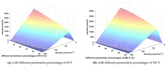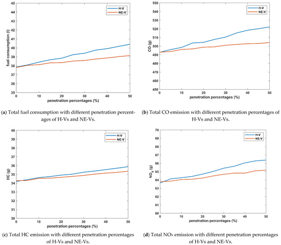 In the V2X environment, it is simple to obtain the type of preceding vehicle by utilizing onboard sensors or other V2X devices [32,33,34]. Thus, it is necessary to incorporate the impacts of the preceding vehicle’s type when modeling car-following behavior in a V2X environment. Compared with the traditional traffic environment, there are also new penetration conditions of the preceding vehicle’s type in the V2X environment. With the increasingly urgent energy situation and stringent emission laws in various countries, new energy vehicles, represented by electric vehicles and plug-in hybrid vehicles, are penetrating the traffic system more and more. Compared with traditional vehicles, there is no doubt that these new energy vehicles are better for the environment. As another type of vehicle, the penetration percentages of new energy vehicles will also affect car-following behavior [35,36,37]. However, in these studies, efforts were devoted to modeling the subject vehicle’s car-following behavior when it is a new energy vehicle. To date, very few efforts have been undertaken to model the subject vehicle’s car-following behavior when its preceding vehicle is a new energy vehicle. Thus, it is still an interesting topic worthy of discussion that the impacts of the penetration of these new energy vehicles with different percentages on the car-following behavior, and further on traffic flow, energy consumption and exhaust emission.