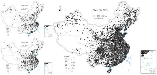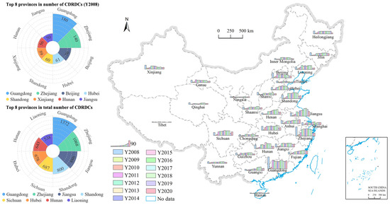 From 2008 to 2020, the number of CDRDCs continued to increase, with 2011–2018 being a period of rapid growth, and more than 1000 CDRDCs were established every year. After 2018, the total number of CDRDCs in each province continued to grow steadily after a slight decline (Figure 2, Table 2). The establishment process of the CDRDC strictly follows the goals and requirements of the National Comprehensive Disaster Prevention and Mitigation Plan (NCDRMP) of China. During the “12th Five-Year Plan” and “13th Five-Year Plan” periods, the numbers of new CDRDCs were 7426 and 6398, respectively, and both exceeded the target of 5000 increments required in the NCDRMP in the same period. Recently, the State Council of China issued the “14th Five-Year Plan for National Emergency Response System”. During the “14th Five-Year Plan” period, the establishment of CDRDCs was still steadily increasing, with the target of adding more than 3000 CDRDCs.