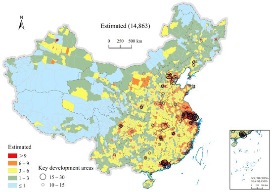 The theoretical number of CDRDCs in China can be estimated based on the fitted coefficient of four influencing factors and the regression equation. The estimated high-value areas (more than 10 CDRDCs) can reflect the key development areas of CDRDCs in the future to a certain extent. As shown in Figure 6, the results show that the estimated spatial pattern of CDRDCs in China is significantly different, and it gradually decreases from east to west. The capital circle, the southeast coast, and the economic belt along the Yangtze River in the eastern and central regions are the densely distributed areas of the estimated CDRDC, while southern Xinjiang, southern Qinghai, and Tibet in the western region are sparsely distributed. The key development areas of CDRDCs are mainly concentrated in the capital circle, the Yangtze River Delta, the Pearl River Delta, eastern Fujian, and eastern Hubei (Table 5).