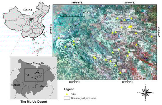 11. Gao, X.; Wang, Y.; Wang, J.; Van, C.; Li, Z. Analysis on desertification dynamics based on remote sensing and GIS in zone along the Great Wall in northern Shaanxi province. J. Desert Res. 2005, 25, 63–67. [Google Scholar]