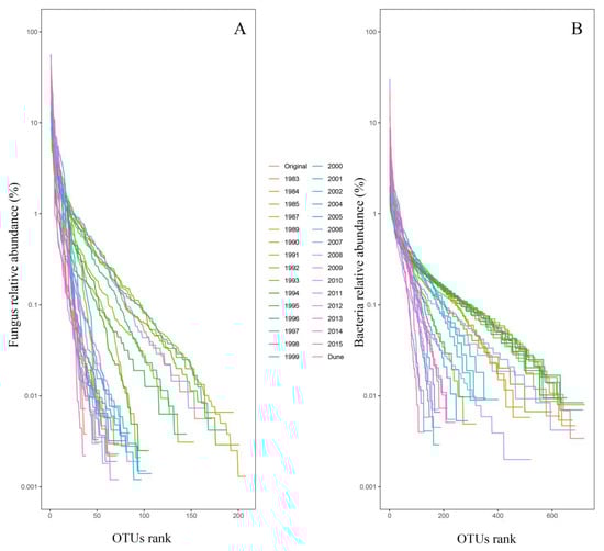 Figure 2. Rarefaction curves of soil fungal (A) and bacterial (B) communities in different aerial seeding years.