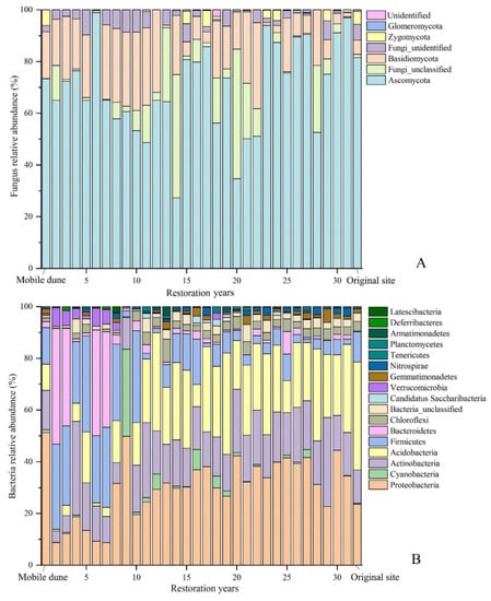 Soil microbial communities link soil and plants and play an important role in the formation and development of soil [1,2]. They can decompose organic matters and minerals in the soil, release nutrients that can be taken up by plants, form humus and eventually improve soil quality. Soil microbial communities contribute to key ecological processes, such as organic matter decomposition and nutrient cycling. They connect the above-ground and below-ground communities in terrestrial ecosystems [3,4]. Therefore, more and more scholars are focusing on soil microbial communities, especially those in degraded lands (e.g., mobile sandy lands after aerial seeding), during long-term artificial restoration. The dynamics of soil microbial communities in such lands are still unclear. Soil fertility has been restored through artificial revegetation [5,6]. Revegetation is the key to ecosystem restoration and stability, and microorganisms play a significant role during ecosystem reconstruction [7]. The impact of artificial restoration on soil microorganisms in degraded ecosystems has been hotly studied by soil scientists and ecologists.