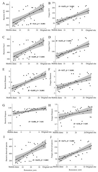 Figure 4. Relationship between the alpha diversity of soil microbial communities and restoration period. The alpha diversity include: (A)—bacteria ACE; (B)—fungus ACE; (C)—bacteria Chao1; (D)—fungus Chao1; (E)—bacteria Shannon; (F)—fungus Shannon; (G)—bacteria Simpson; (H)—fungus Simpson; (I)—bacteria observed species; (J)—fungus ACE.