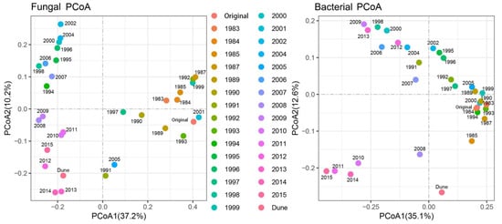 A total of 7 phyla, 20 classes, 57 orders, 115 families, 174 genera, and 284 species of fungi and 17 phyla, 47 classes, 79 orders, 147 families, 273 genera 313 species of bacteria were observed in the soil samples corresponding to different aerial seeding years. The histograms of the abundance of species at the phylum level show that the structures of soil fungal and bacterial communities vary in different aerial seeding years (Figure 3). The alpha diversity of fungi and bacteria shows significant increasing trends with the restoration period (Figure 4). In addition, the PCoA reveals a clear chronocline in the restoration time series of soil microorganisms (Figure 5).
