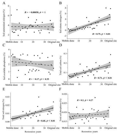 Figure 6. Relationship between soil nutrient indexes and restoration period. The soil nutrient indexes include: (A)—soil ammonium nitrogen; (B)—soil nitrate nitrogen; (C)—soil available phosphorus; (D)—total soil carbon; (E)—total soil nitrogen; (F)—total soil phosphorus.