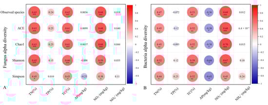 Figure 7. Relationship between the alpha diversity of soil fungal (A) and bacterial (B) communities and soil nutrient indexes. * represents p < 0.05, ** represents p < 0.01, *** represents p < 0.001.