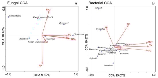 Figure 8. CCA results of the relationship of soil fungi (A) and bacteria (B) with soil nutrient indexes at the phylum level.