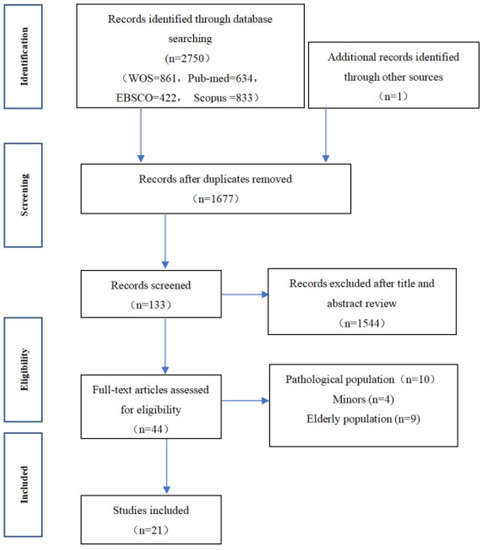 A total of 2750 relevant studies were obtained through an initial database search. First, the articles were imported into the literature management software Endnote, and then 1677 articles were obtained after eliminating duplicate literature. After reading the titles and abstracts to exclude irrelevant literature, 133 articles were initially obtained. Subsequently, the remaining articles were read in full text, and after excluding irrelevant articles, 20 articles were obtained. In addition, one relevant article was added by manual reference search. Finally, 21 articles were included for systematic review and analysis (Figure 1).