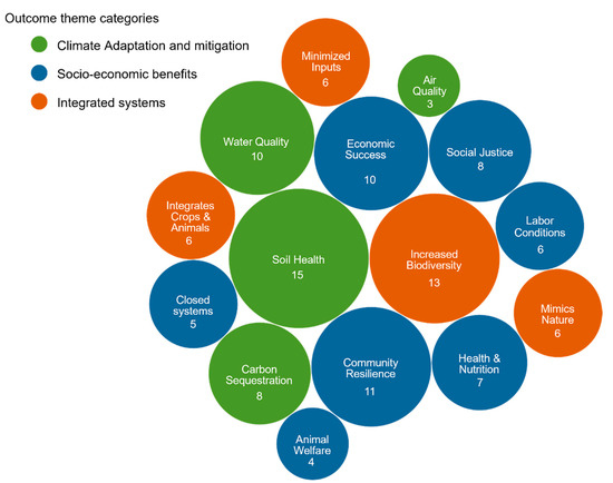 Regenerative agriculture outcome theme categories and subcategories. Each size of the bubble corresponds with the number of participants who referenced the named outcome, with larger bubbles representing more participant references to indicate which outcomes were most prominent. Note: numbers are not statistically significant.