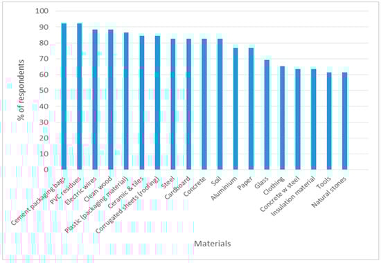 C&DW has been extensively studied in developed countries, but few reports are from low- and middle-income countries, such as Costa Rica. Therefore, a study was performed in the country with the participation of fifty-two (52) companies: 30 small, 15 medium, and 7 large firms. They were asked, among others, the types of non-hazardous and hazardous waste produced during the development of their projects. Figure 1 and Figure 2 show the percentage of companies that reported the generation of the specific non-hazardous and hazardous waste streams. The most common non-hazardous materials include cement bags (2-layers kraft paper + polypropylene), pieces of polyvinyl chloride (PVC), electric wires, clean wood, and plastic (high and low density) packaging materials [29]. At the time of the study, the insulation materials were considered as non-hazardous, as mentioned by del Río Merino et al. [30]. On the other hand, polyvinyl chloride (PVC) was at the center of a controversial debate, in which a number of diverging scientific, technical, and economic opinions have expressed that it affects human health and the environment.