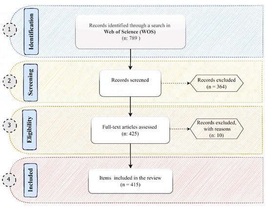 Web of Science (WOS) was used to acquire the necessary data for the bibliometric analysis. This database has been noticeably used in relevant studies [45,47,51,52,53]. It contains over one billion cited reference connections and rich bibliometric data collected over the previous decades that enable researchers to implement various analyses in bibliometric software tools (i.e., VOSviewer). We designed a wide search string to enable the inclusion of numerous appropriate documents on transformative urban resilience in our analysis. The specific search string was searched in either the title, abstract, or keywords: TS = (((“resilient” OR “resilience”) NEAR/10 (“transformative” or “transformational” or “evolutionary”)) OR (“transformative adaptation” OR “transformational adaptation”)). This search string considers different variants of terms related to transformative adaptation and resilience, such as transformative resilience, evolutionary resilience, and transformative adaptation, that are commonly used in the literature. On 28 September 2021, we conducted a literature search for an infinite period, yielding 789 records. We then scrutinized the titles and abstracts of all retrieved records to include or exclude them based on three inclusion criteria. These were relevant to the contexts of climate change, urbanization dynamics, and natural hazards; our focus on urban/local scales; and our concentration on multi-faceted constructs within urban systems, including water, food, energy, healthcare, supply chain, planning, and leadership.