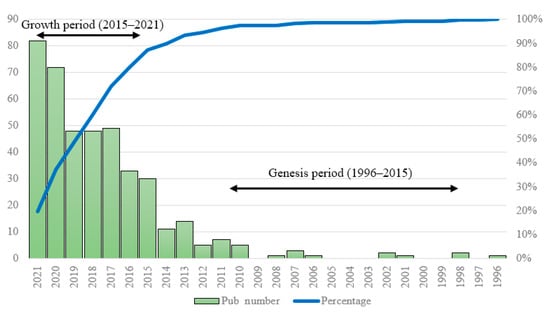 Figure 2 is a Pareto chart indicating the transformative resilience publications trend for 1996–2021. Since the publication of the first paper in 1996, about 415 papers have so far been published on this subject based on the Web of Science search. This figure demonstrates an irregular publication trend, with the number of publications increasing exponentially since 2015. Based on the cumulative percentage line, about 50% of publications were disseminated in the last three years. The study years (1996–2021) are classified into two sub-eras based on the development speed of publication directions. The initial era encompasses the years from 1996 to 2015, when the publication speed was slow and fluctuated. In sum, only 53 (13% of the sample) papers were published in this period. One explanation of this background is that the term transformation has not been well-positioned in international policy and scientific discourses on “development, climate adaptation, and disaster risk reduction” [2]. Despite some underlying academic efforts in characterizing transformation and the associated necessities to navigate the shift toward fundamental transformative resilience [23,24,54,55,56], many resilience initiatives have been limited to the understanding of the concept as reactive absorptive coping or moderative incremental adaptive capacities aiming at managing the impacts of disasters or changes, and gradually streamlining available standards and adjusting to keep the continuity of systems, respectively [57].