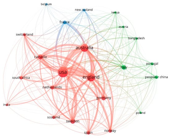 Dominant countries and their interconnections in the transformative resilience literature. The size of nodes represents the digit of publications, and the density of links and different colors display to what extent these countries are interconnected.