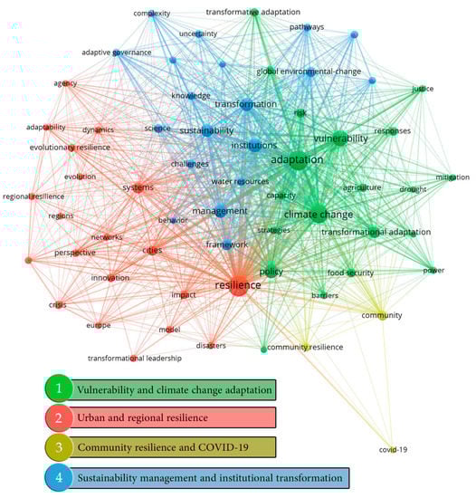 Co-occurrence analysis is a technique that utilizes terms used in the title, abstracts, and keywords to demonstrate major topics and their linkages within a certain study subject [65]. We used the VOSviewer software’s term co-occurrence analysis to identify important topic areas and priority research themes in urban transformative resilience literature. The most popular items between 1996 and 2021 were “resilience” (N = 170; 10%), “adaptation” (N = 150; 9%), “climate change” (N = 122; 7%), and “vulnerability” (N = 78; 5%) (Table S1). The arrangement and links between the dominant terms enable us to reveal and group concepts that are strongly related in the selected literature. The analysis highlighted four primary clusters (Figure 4). The node size represents the frequency of keywords. The thickness of the links between nodes is proportional to the strength of connections between them. As Figure 4 displays, some other terms such as institutions (N = 62, 3.8%), policy (N = 61, 3.7%), management (N = 55, 3.2%), and transformation (N = 52, 3%) also represent high values of occurrence, indicating that they are considered as enabling forces of transformative pathways to navigate the paradigm shift toward fundamental transformative resilience in the relevant discourses [66,67,68,69]. Similarly, the high link strength of these terms reveals that they are considerably interconnected to other keywords. The most popular keywords, including resilience, adaptation, policy, management, and institutions, are placed close to the edges of the clusters, commenting that they cut across all themes. This is because transformative resilience is a multidisciplinary and multifaceted concept calling for an intentional shift in institutional structures and planning mechanisms to predispose cities to transform themselves against uncertain circumstances. [8,29].