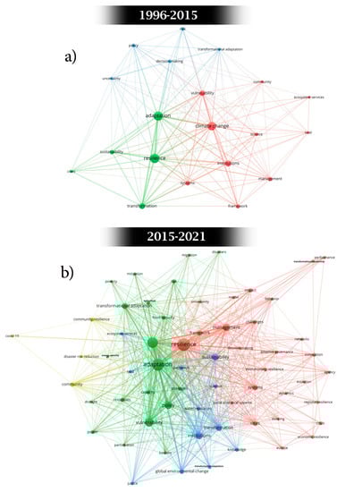To detect the subject emphasis change, we used a separate term co-occurrence analysis by dividing the dataset into two sub-periods. The first group includes the research conducted from 1996 to 2015 (N: 53, 13%). The second group encompasses a greater number of studies published from 2015 to 2021 (N: 362, 87%). Overall, the three terms, “resilience,” “adaptation,” and “climate change,” have been the most frequently co-occurred keywords in both periods. As Figure 5a shows, institutions, transformation, and vulnerability have been other highly emphasized keywords in the first period (1996–2015), indicating that the literature has started to embed resilience as adaptive and system-based thinking into institutional settings to challenge or redress underlying drivers of vulnerability. The first period can be divided into two sub-periods: the genesis (1996–2000) and development (2000–2015). In the genesis phase (1996–2000), adaptation is the most used term for the concept of resilience that appears in multiple disciplines, such as complex systems, sustainability, and urban scale risks [106,107,108]. In the development phase (2000–2010), the literature distinguishes between adaptive and transformative capacities for resilience and gravitates to the transformation of multiple systems and institutions via bounce-forward frameworks and approaches [54,109,110]. Nevertheless, the field was still in its infancy during the first period, and only a few underlying themes emerged in the analysis. Overall, the first period includes those narratives that have mainly focused on improving the resilience of complex socio-ecological systems such as cities by adaptation measures to drive the required transformation for medium to long-term resilience (green cluster). Another focus area has been examining the vulnerability of different systems (e.g., ecosystems, communities, land, etc.) by analyzing institutional arrangements, frameworks, and management to handle the challenges posed by climate change (red cluster). However, transformational pathways for capacitating policy and decision-makers to guide the transition toward disaster risk reduction and long-term resilience are limited (blue cluster).