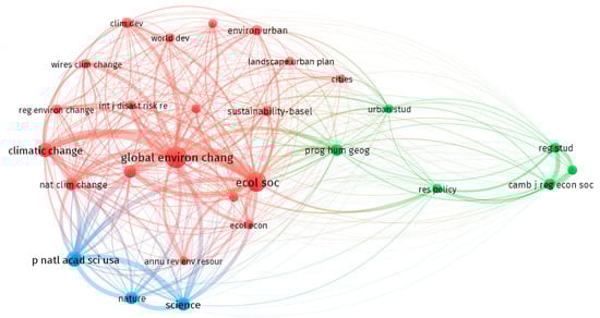 Most leading sources in transformative resilience literature. Node size is proportional to the number of publications, and link thickness reveals the strength of connections between the journals. In addition, different colors refer to clusters of closely linked journals.