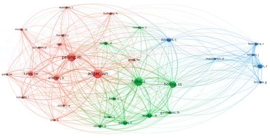 The final step in this section was exploring the most influential authors in underpinning and transforming the field. Using “co-citation” analysis and fixing the lowest number of citations per scholar to 30, the analysis identified 31 influential authors in three main clusters (Figure 7). The red cluster includes those influential authors from human geography that have focused on the conception and assessment of adaptive and transformative capacities for resilience to reduce disaster risks and vulnerability posed to human communities by natural hazards or climate change. The top three influential authors with at least three-digit citations (Adger, Pelling, and O’Brien) belong to this cluster. The green cluster consists of the influential authors from the socio-ecological (Holling, Folke, Berkes, and Walker) school of resilience that have highlighted the need for transformational adaptation of complex social-ecological systems since incremental adaptation is often insufficient because of the inherent and inevitable changes of these systems. Adaptive governance and management is a key concept for these authors for capacitating social-ecological systems to drive the required transition toward transformative resilience [24,54,123].