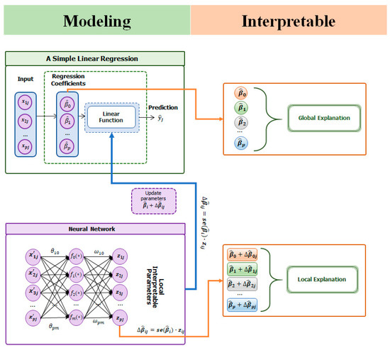 Furthermore, there are several similar approaches for tabular data [25,26,27]. For example, Bildirici and Ersin (2009) [25] improved GARCH family models by artificial neural networks for financial time-series data. Furthermore, Bildirici and Ersin (2014) [26] also combined Markov switching ARMA-GARCH model with neural networks to predict exchange rates and stock returns. They used neural network approach to predict the parameter of ARMA and GARCH models, which is very similar with our work. Recently, LocalGLMnet architecture has been proposed in Richman and Wuthrich, (2021) [27], which is also very similar with our proposed architecture. This model improves the predictive power of GLMs by using neural networks and provides an explainability same as GLMs. The authors predict the parameters of GLMs using neural network to achieve superior predictive performance. The idea of this work is same as our proposed model, but the predicted parameters cannot be consistency of explaining the logical relationship between input and output variables. This is because the predicted parameters of GLMs highly depend on the weight parameter initialization for neural networks since they use gradient descent optimization algorithm to train LocalGLMnet. In other words, the main advantage of our work is that we first perform OLS to obtain unbiased regression coefficients, and then update them into their confidence intervals using neural network approach.