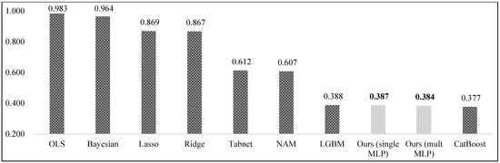 Our proposed model achieved outstanding predictive performance on 3 out of 8 datasets (Energy Efficiency, Naval Propulsion, and Bodyfat) for RMSE evaluation metric and showed similar predictive performance on the other datasets (see Table 2). The regression baseline models showed poorer predictive performance than our proposed model on all datasets. As shown in Table 2, the predictive performance of OLS regression is weaker than that of the Lasso, Ridge, and Bayesian regressions, but its predictive power has improved significantly after being augmented by the neural networks. Table 3 reported the predictive performance on 8 datasets using the MAE evaluation metric. From the results, we can see that our proposed model notably outperformed the regression and the state-of-the-art baseline models on four datasets (Energy Efficiency, Naval Propulsion, Protein Structure, and Bodyfat).