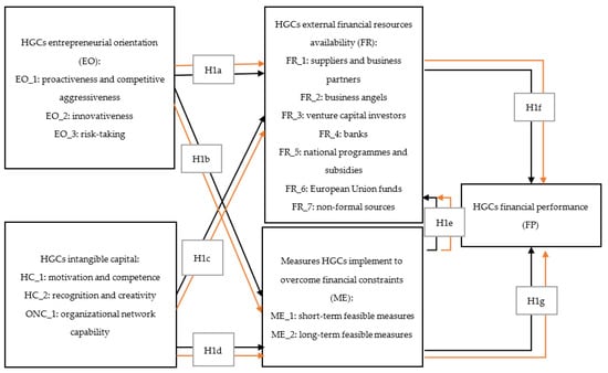 Financial performance is the fundamental goal of a commercially oriented company, which is especially important for HGCs. The financial performance of the company can be defined as the profitability of a company that enables the company to survive, succeed, and develop [70], thus achieving the desired level of sustainability at a given time and in the future. Numerous studies have shown that there is an important relationship between access to financial resources and financial performance [71,72,73]. In addition, previous research suggests that companies can use their financial resources efficiently to achieve the benefit of identifying new opportunities, leading to superior financial performance and sustainability.