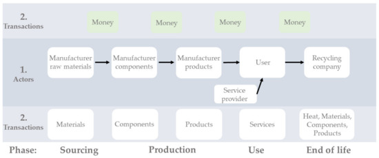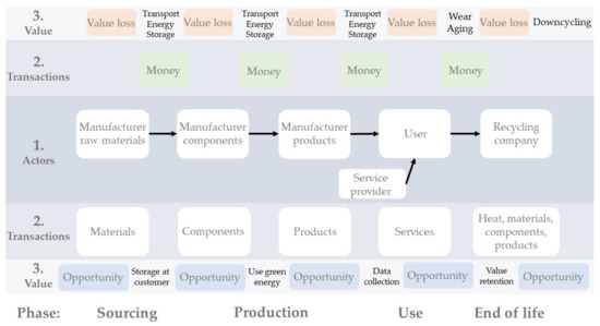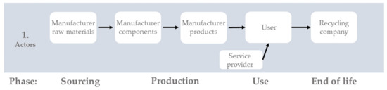 To identify economic and environmental value losses, the value chain is investigated. Therefore, all key actors are added in the value chain, such as the manufacturer of raw materials, components’ manufacturer, sales organization, user and the recycling company, as can be seen in Figure 2.