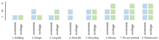 The linear economy is the most concerning problem in context of the resource crisis [] and is also often referred to as the “take, make and waste” economy []. The idea of the circular economy offers solutions to that issue. The circular economy has been highlighted by the Ellen MacArthur Foundation, among others, and is already being applied in industries as a policy objective, in particular within the EU Green Deal and Circular Economy Action Plan [,]. With this concept, products are made to last to be reparable, remanufacturable and recyclable []. Essential in this context are design principles, because at least 70% of the environmental impact of a product is already predetermined in the design phase of a product [].