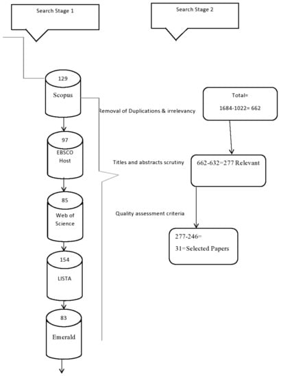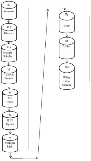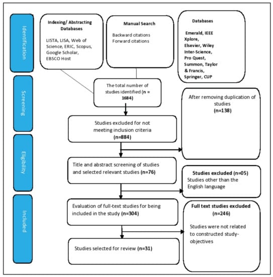 A total of 1684 results were retrieved through fifteen of the world’s leading digital databases and electronic tools: 129 through Scopus, 97 via EBSCO Host, 85 from Web of Science, 154 by LISTA, 83 through Emerald, 84 via LISA, 89 from Summon, 223 by Elsevier, 128 through Google Scholar, 26 via Taylor & Francis, 85 from Pro-Quest, 94 by IEE Xplore Digital Library, 74 through Springer Link, 27 via Cambridge University Press, and 306 from Wiley Inter-Science. These results were retrieved from January 2022 to May 2022. After critical identification, screening, eligibility, and inclusion criteria, 31 impact-factor research papers were included to carry out the current study. Figure 3 shows the breakdown of the results from each digital database and electronic tool.