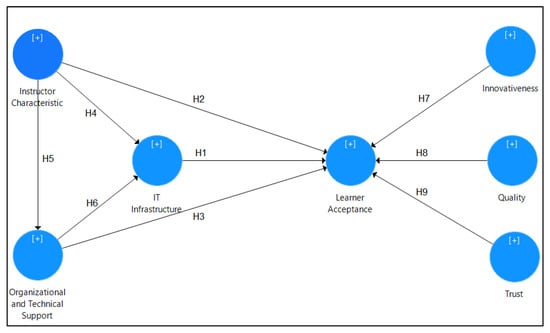 The extent to which the industry describes a set of required features that must be included in a product in order to improve its lifetime performance is known as system quality [40]. The information systems model considers system quality a critical success factor influencing the user satisfaction and the intent to use the product [41]. It has been determined that the system’s quality to individual users positively and significantly affects how they perceive and behave concerning the acceptance and the adoption of new technological inventions [42]. Moreover, research has found that the main reason for the widespread loss and dropout rate in online learning is the perceived low quality of the online learning system [42,43]. The service quality is also considered to positively affect the behavioral intentions of students and teachers in implementing online learning technology.