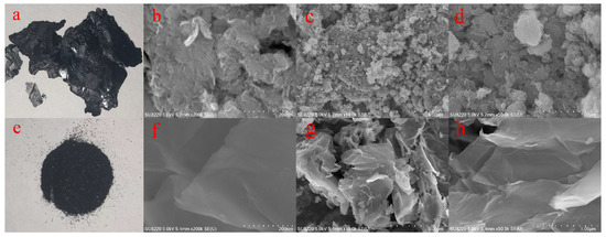 Figure 1a (GO) and Figure 1e (GO-TOA) show the camera photos before and after GO modification. It can be seen from camera photos that the GO was changed from a typical sheet shape to a powder form after self-assembly [24]. Figure 1b–d show the SEM images of GO under the different magnitudes of enlargement conditions, where Figure 1b–d are SEM images with dimensions of 200 um, 5 um, and 1 um, respectively. It can be seen from the Figure that GO has the same multilayer structure as previously reported [25]. Figure 1f–h show the SEM images of GO-TOC under the different magnitudes of enlargement conditions, where Figure 1f–h are SEM images with dimensions of 200 um, 5um, and 1um, respectively. It can be seen from the Figure that GO-TOA exhibits a single-layer structure and a porous structure. Therefore, it indicates that the material is successfully synthesized.