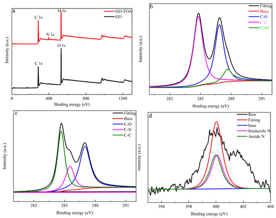 The survey XPS spectra of GO and GO-TOA (a), C 1s XPS spectra of GO (b), C1s XPS spectra of GO-TOA (c), and N 1s XPS spectra of GO-TOA (d).