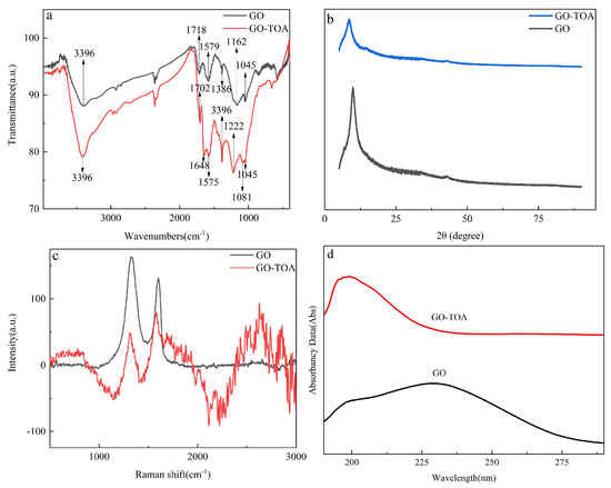 As can be seen from Figure 3b, there is a sharp peak at 2θ = 10.1°, which is a typical crystal face peak of GO [27]. After the introduction of thiourea, the peak at 2θ = 10.1° was red-shifted to 9.70°, and the intensity of the peak was slightly lowered, indicating the crystal plane structure of the substance changed after the introduction of thiourea [24,27]. Therefore, the synthesis of GO-TOA was sufficiently confirmed.